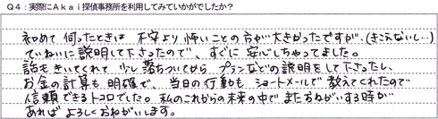 話も聞いてくれて、少し落ち着いてからプランなどの説明をして下さったし、お金の計算も明確で、当日の行動もショートメールで教えてくれたえので信頼できるトコロでした。私のこれからの未来の中でまたおねがいする時があれば、よろしくおねがいします。