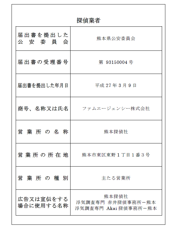 | 受理番号 | 沖縄県公安委員会探偵業届出97190011号 |