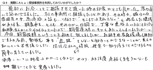 落ち着いて話ができました。別の事務所に相談したことがあり、その時は、煽られる雰囲気の中、高価格の話も一方的で、"そこまでは支払えない"と断念した経緯があります。調査中も、とてもやわらかい口調で、丁寧な連絡をいただけました。