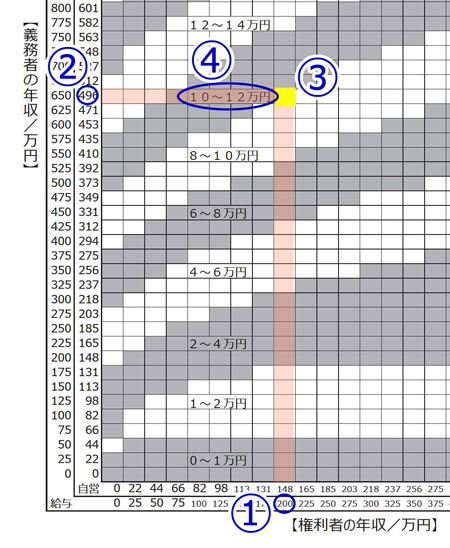 それぞれの年収の位置からまっすぐ線を伸ばし、交わった③が、義務者から権利者に支払われる養育費の月額目安となります。