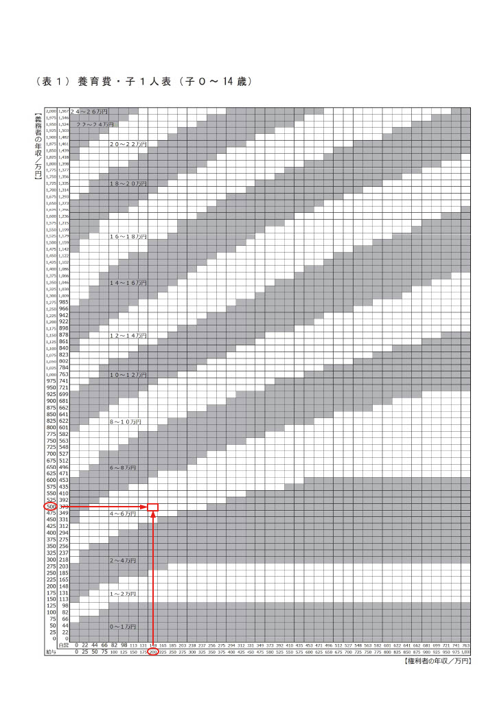 養育費算定表は子供どもの人数と年齢に応じて9つの表に分かれていて、どの表も、縦軸は養育費を支払う親(義務者)の年収、横軸は子を引き取って育てている親(権利者)の年収を示し、 縦軸の左欄と横軸の下欄の年収は給与所得者の年収を、縦軸の右欄と横軸の上欄の年収は、自営業者の年収を示しています。
